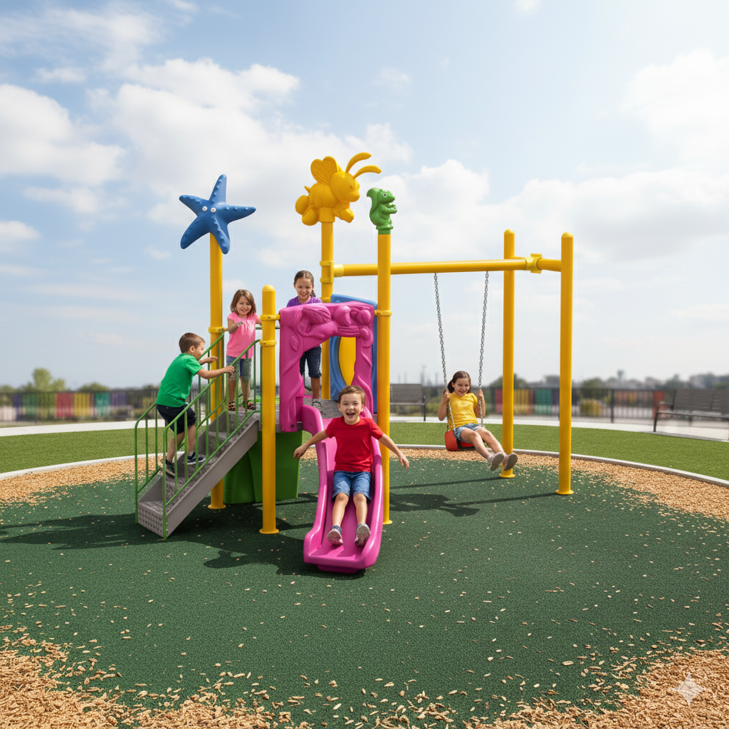 Eğri Kaydırak + Pano (h100 cm) : 1 Adet Kütük Tırmanma : 1 Adet Salıncak Seti : 1 Adet Figürlü Pano : 1 Adet Sincap Figür : 1 Adet Arı Figür : 1 Adet Deniz Yıldızı Figür : 1 Adet Platform h100 cm : 1 Adet