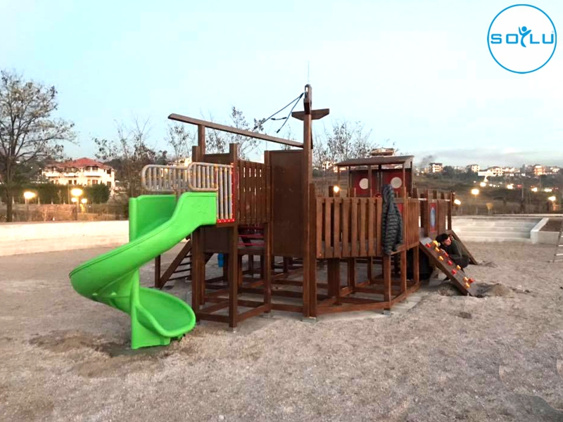 Arnavutluk’ta hayata geçirilen SG-14 Ahşap Gemi Oyun Parkı, deniz temalı tasarımıyla çocuklara hayal güçlerini özgürce kullanabilecekleri benzersiz bir oyun alanı sunar. Gemiyi andıran estetik formu, halat tırmanma alanları, kaydıraklar, oyun panoları ve gözetleme noktalarıyla çocukların fiziksel ve zihinsel gelişimini destekler. Bu model, özellikle sahil parkları, okul bahçeleri, kampüs alanları ve çocuk dostu sosyal tesisler için ideal bir çözümdür.