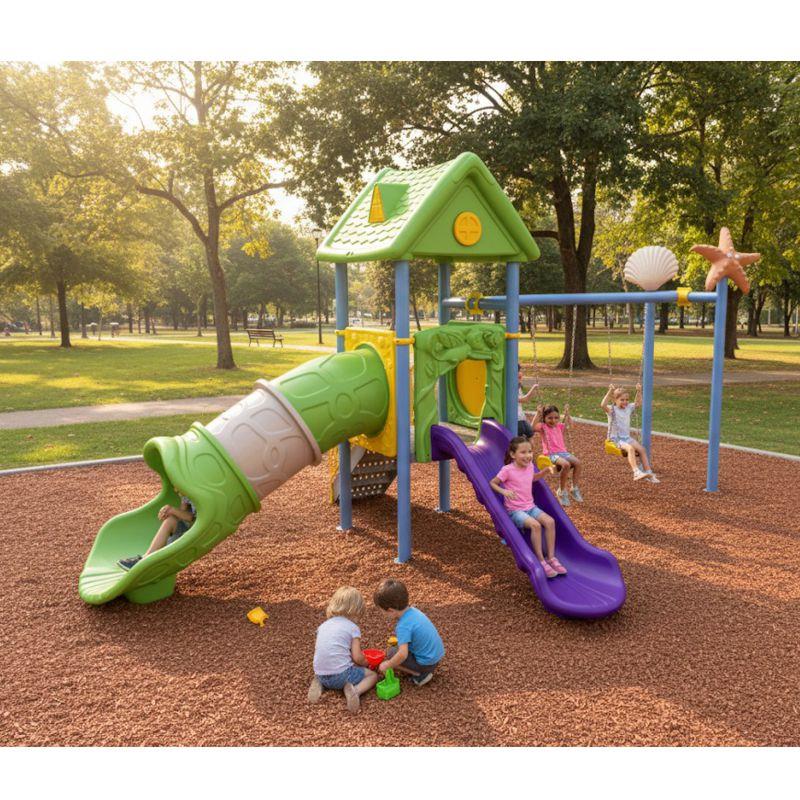 This house-themed children’s playground model features a combination of two slides—one tube slide and one straight slide with panel—alongside two swings, a roofed structure, and themed decorative elements such as a starfish and a seashell. It is designed to offer a safe and engaging play environment that supports physical development, coordination, and imaginative play. The bright colors and playful design elements attract children’s attention, while the structure provides multiple play functions in a compact area. Suitable for children aged 4–12, this model is ideal for use in parks, schoolyards, and residential outdoor areas. Built from durable materials and compliant with EN1176 safety standards, it ensures long-term and safe outdoor use.