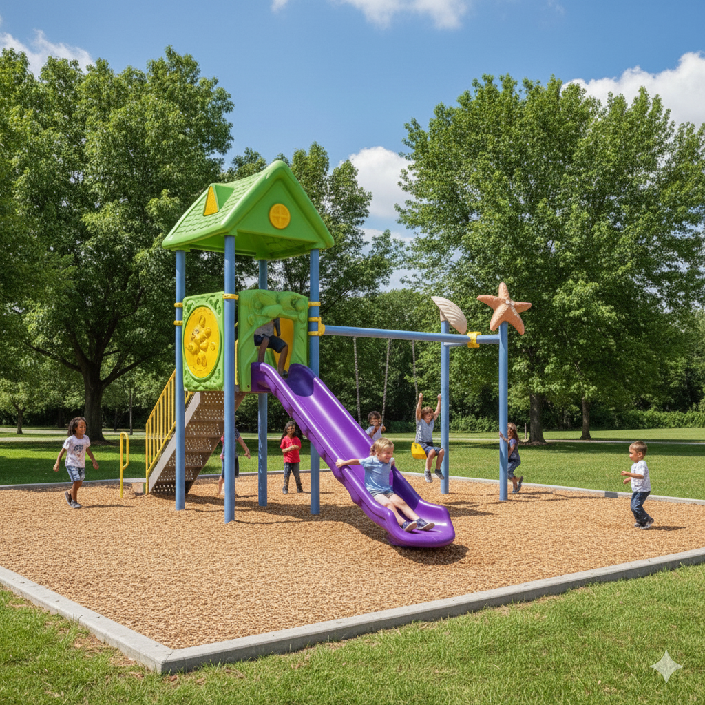 Material: LLDP polyethylene plastic and electrostatically painted metal frame Standard: Complies with EN1176 child safety standard Slide: 1 straight polyethylene slide Swings: 2 children’s swings (polyethylene seat + galvanized chain) Roof: UV-resistant polyethylene playhouse-style roof Platform Height: Approximately 100 cm Fasteners: Galvanized bolts, screws, and plastic safety caps Ground Anchoring: Anchoring equipment included for concrete and soil surfaces Age Group: 4–12 years Areas of Use: Residential gardens, parks, nurseries, and kindergartens