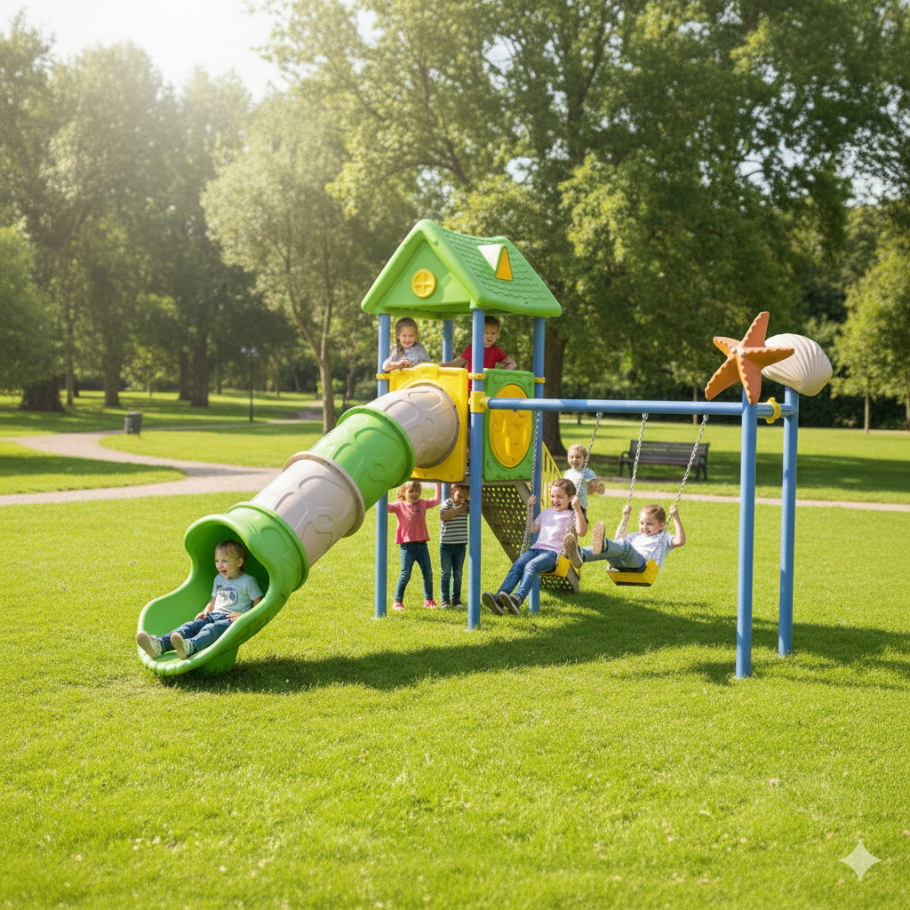 Material: LLDP polyethylene plastic, electrostatically painted metal construction Standard: Complies with EN1176 European safety standard Slide: 1 Tube slide (polyethylene) Swings: 2 children’s swings (polyethylene seat, metal chain) Themed Figures: Sea shell and starfish Roof: UV-protected polyethylene house-type roof Fasteners: Galvanized bolts and screws, plastic cap covers Ground Anchoring: Includes anchoring suitable for soil and concrete surfaces Age Group: Suitable for children aged 4–12 Areas of Use: Parks, schoolyards, residential community areas